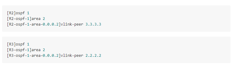 出现此现象,是因为当前 OSPF 环境中无 ABR 设备存在,针对该拓扑环境,我们可用vlink(虚链路)来解决此问题,但如果要基于该环境实现全网互连互通,就需将 Vlink 部署在 R2 与 R3 设备上,基于区域 2 做 Vlink。