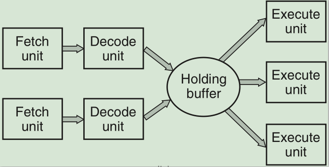 8. 更优化的CPU架构是superscalar架构(超标量架构)。这种架构将取指、解码、执行单元分开,有大量的执行单元,然后每个取指+解码的部分都以并行的方式运行。比如有2个取指+解码的并行工作线路,每个工作线路都将解码后的指令放入一个缓存缓冲区等待执行单元去取出执行。