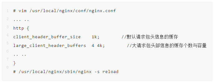 2)修改 Nginx 配置文件,增加数据包头部缓存大小