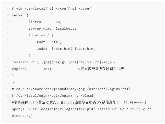3)改Nginx配置文件,定义对静态页面的缓存时间