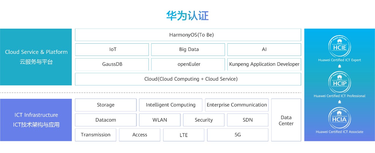 为匹配华为公司未来长期战略,紧随ICT技术演进趋势,2021年1月1日华为认证体系由原“ICT技术架构认证、平台与服务认证、行业ICT认证”三类调整为“ICT技术架构与应用、云服务与平台”两类。