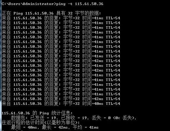 在默认情况下,一般都只发送四个数据包,通过这个命令可以自己定义发送的个数,对衡量网络速度很有帮助,比如我想测试发送10个数据包的返回的平均时间为多少,最快时间为多少,最慢时间为多少就可以通过以下获知: