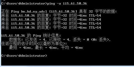 ping-a解析计算机名与NetBios名。就是可以通过ping它的ip地址,可以解析出主机名。当你遇到一个ip,却不知道他是那个设备时,这时你可以通过ping -a知道它的主机名。