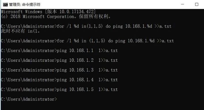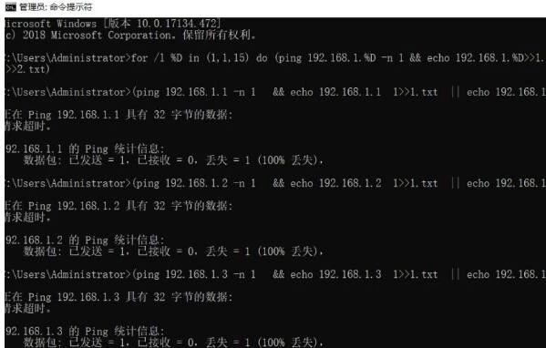 上面的命令虽然能批量ping 地址,但是上面代码在命令行窗口显示数量多的时候看起来也很麻烦,那么再升级一下,用下面的代码。